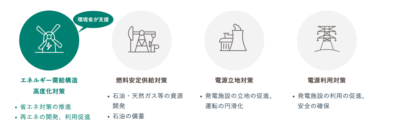 このうち、環境省では、エネルギー需要構造高度化対策として、省エネルギー対策の推進や再生可能エネルギーの開発・利用促進を支援しています。具体的には、再エネや省エネ設備を導入することで温室効果ガス削減を実現する補助・委託事業を実施しています。