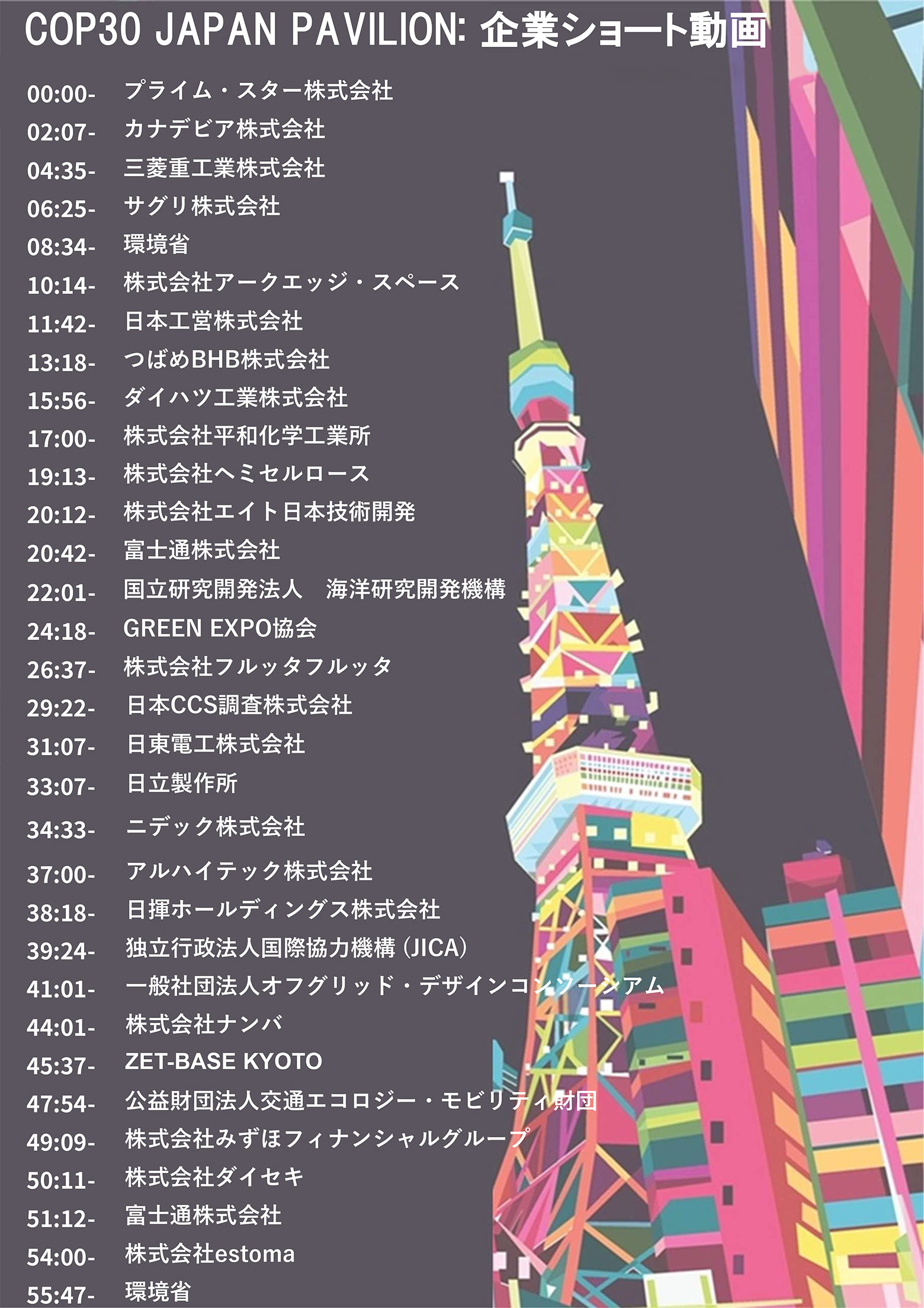 以下リンク先では、COP30ジャパン・パビリオンに出展する企業によるプレゼンテーション動画(各企業ショート動画をつないだもの)を公開しています。1時間程度にまとめていますので、ぜひご覧いただければ幸いです。
